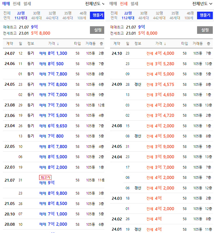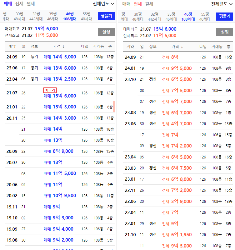 45평형의 경우 '21년 7월에 최고가 15억 6,000만원에 매매 거래된 이후 최근에는 14억원대 거래가 있었습니다. 현재 네이버 매도 매물 16억원~20억원으로 나와있으며 전세 매물은 9억 2,000만원으로 나와있습니다. 갭투자시 현금 8억원 이상 필요해 보입니다.