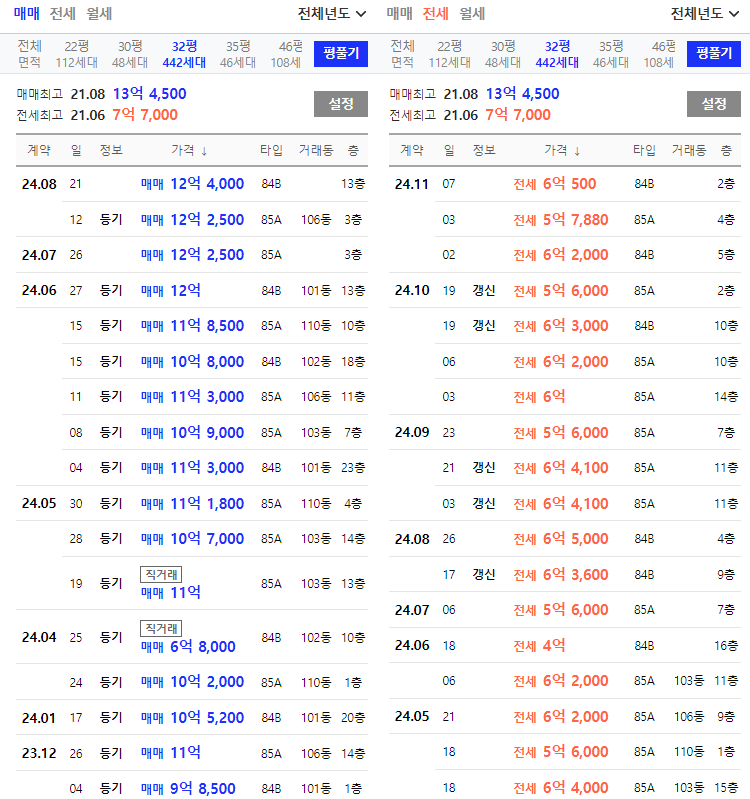 31평형의 경우 '21년 8월에 최고가 13억 4,500만원에 거래된 이후 최근에는 12억원대 거래가 이루어졌습니다. 현재 네이버 매도 매물의 경우 13억 5,000만원~15억 5,000만원에 나와 있으며 전세는 6억 5,000만원~7억원으로 나와있습니다. 갭투자시 현금 8억원정도 필요해 보입니다.